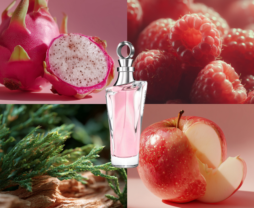 Это не утренняя росистая роза, а глубокая, спелая, почти тёмно-бордовая. Она погружена в сладкую глазурь из питахайи, малины и чёрной смородины; «приправлена» красным яблоком и грушей, обрамлена пышностью магнолии и жасмина. В её шлейфе звучат тёплые, успокаивающие аккорды ванили, карамели, кедра и амбры.